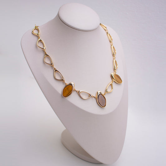 Possebon Joias Set Collar y Pantallas Stud, Piedra Natural Ojo de Tigre, Brass Gold Plated