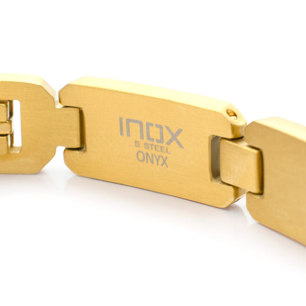 Men's 18Kt Gold IP Matte Finish Steel Black Onyx Stone Inlay Sizeable Link Bracelet. Comes with 1 Self-Adjustable Link (L). Every 9.5mm wide links inlaid with Black Onyx, finished with 18k brushed gold IP. Strength and refinement in one seamless piece.
